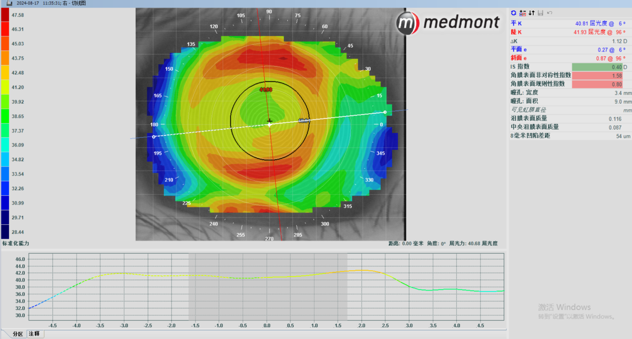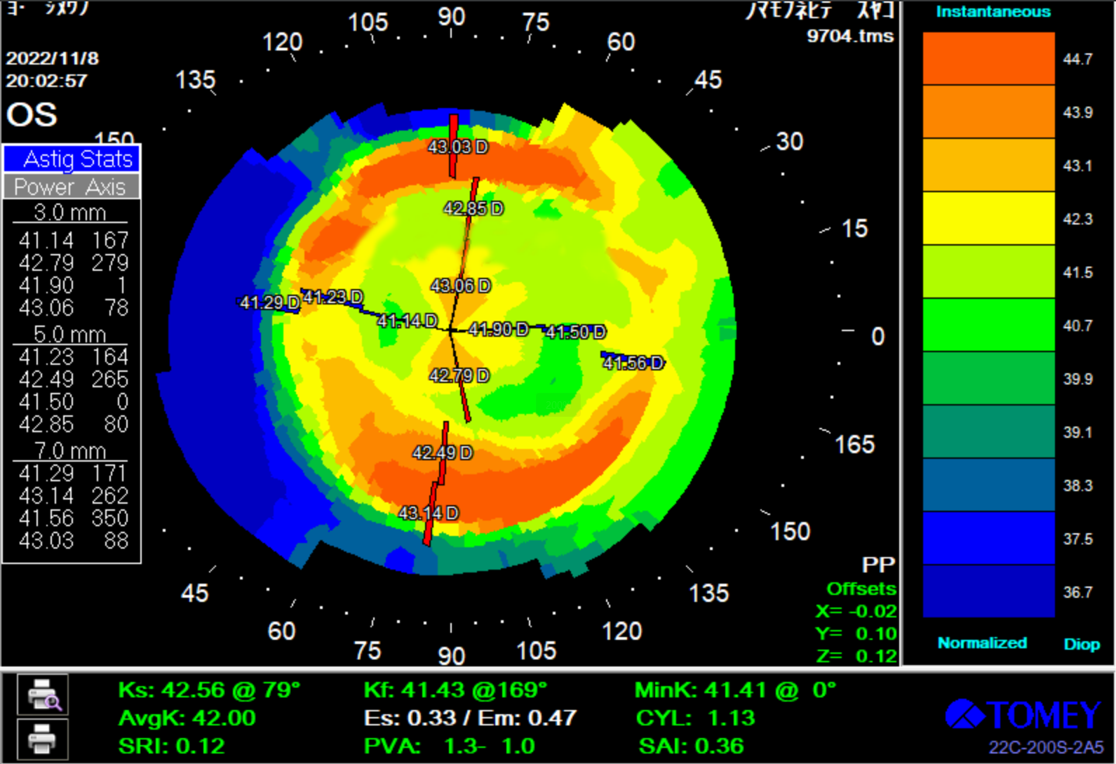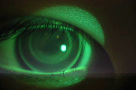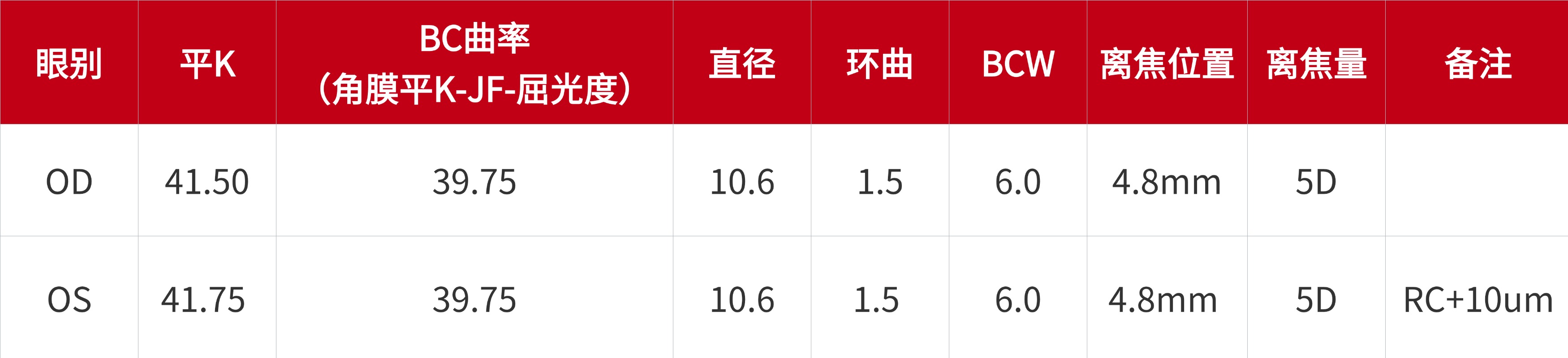 OS:镜片定位居中,活动度良好,镜片直径适中,BC、RC边界略欠清,BC、RC弧段宽度适宜,AC无漏液,PC为均匀亮环