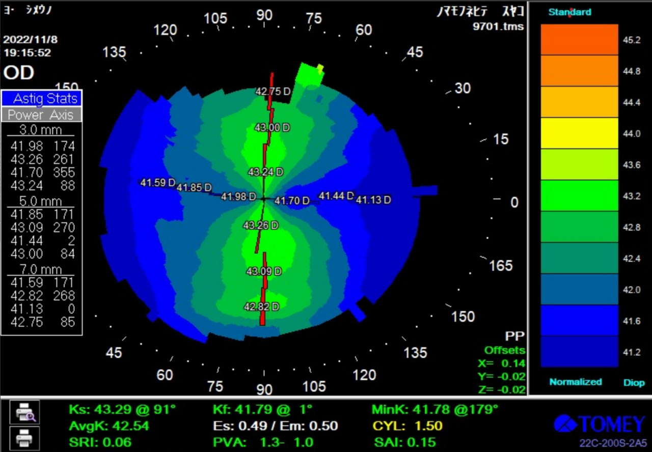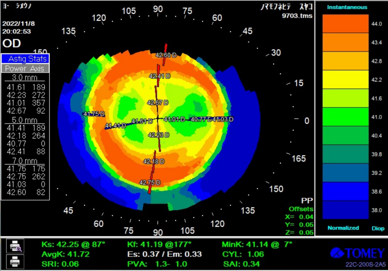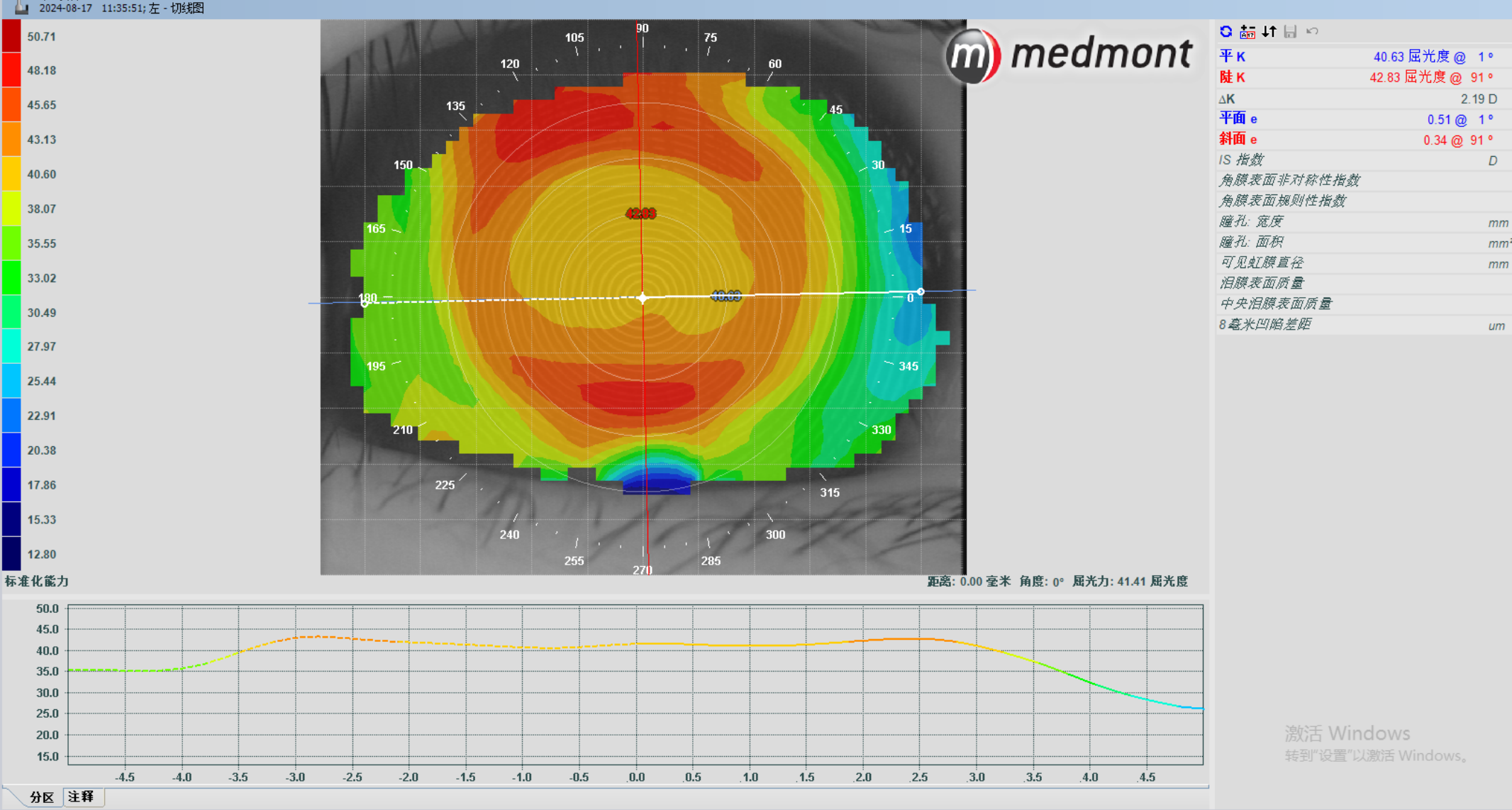 OS:镜片定位居中,活动度良好,镜片直径适中,BC、RC边界略欠清,BC、RC弧段宽度适宜,AC无漏液,PC为均匀亮环