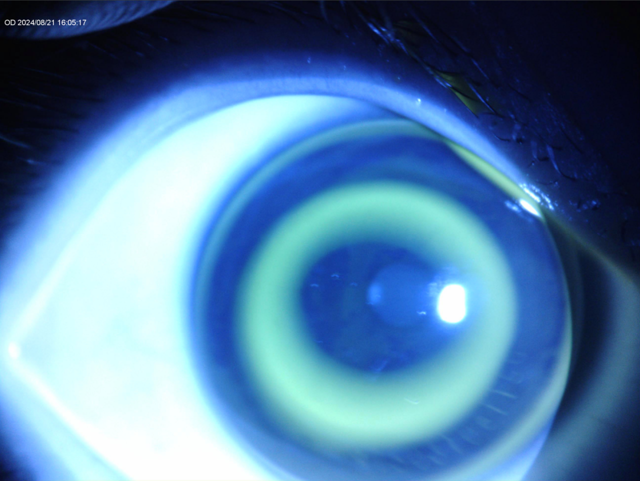 OD:镜片定位居中,活动度良好,镜片直径适中,BC、RC边界略欠清,BC、RC弧段宽度适宜,AC无漏液,PC为均匀亮环。